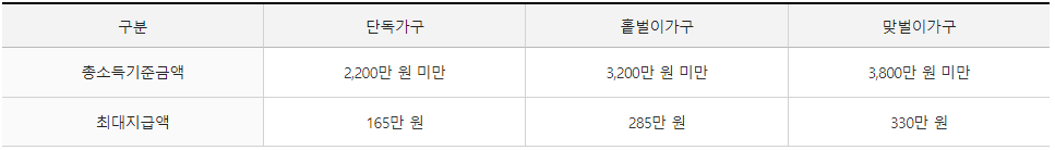 가구원 구성에 따라서 연간 부부합산 총소득금액이 기준이 되며, 그 금액의 미만이 되어야 합니다. 단독가구는 총소득금액기준이 2200만 원 미만으로 제한하고 있으며. 홑벌이가구의 경우에는 3200만 원 미만입니다.