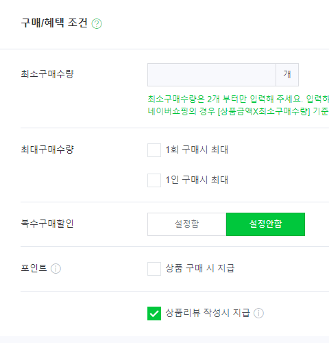 구애혜택 조건을 등록합니다. 저는 리뷰 작성 시에 포인트지급을 하고 있습니다.