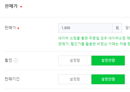 할인을 하실 거면 설정함을 눌러 설정해 주시고 할인 기간을 설정해서 판매하실 거면 판매기간을 설정함을 눌러 설정합니다. 저는 설정할 것이 없어서 안 했습니다.