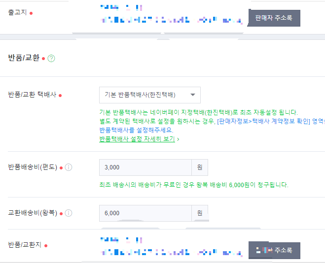 출고지와 반품교환 지는 판매자주소록을 클릭하시면 주소저장이 됩니다.