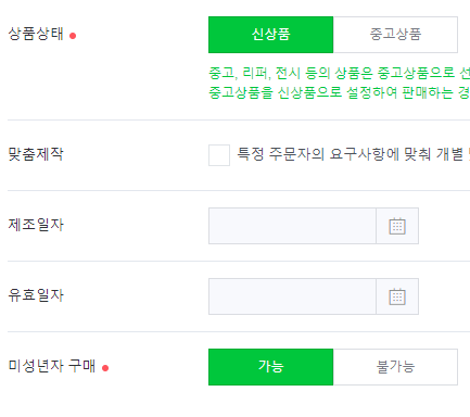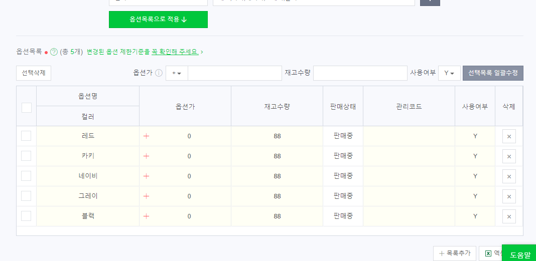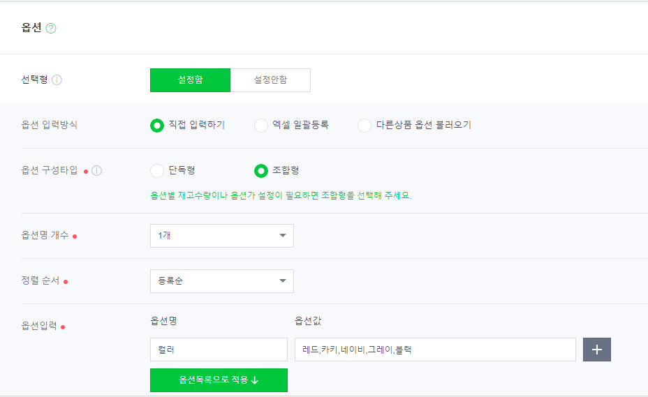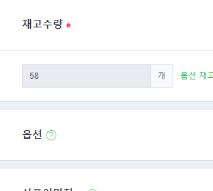 재고수량을 적어주고 아래에 있는 옵션에 해당하는 항목들이 있으면 등록하셔야 합니다.