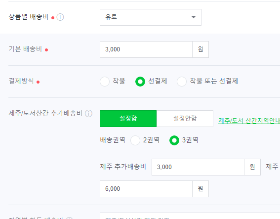 기본배송비는 3,000원 정도 등록하고 제주산간도 설정해 줍니다. 업체들 마다 다르기 때문에 실수 없이 잘 기입하시기 바랍니다.