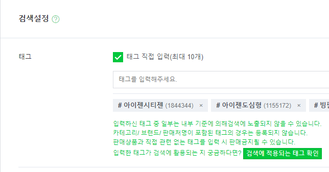 검색설정을 등록합니다. 키워드개념이고 이 검색어를 통해 물건을 찾으시는 경우가 있으므로 상품노출을 위해서는 꼭 등록하셔야 합니다.