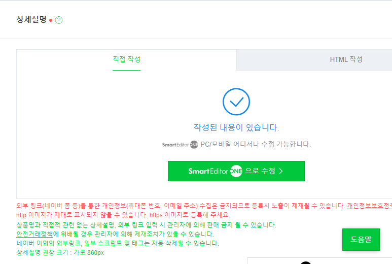 상세설명에 스마트에디터를 누르면 상세페이지를 작성하실수 있습니다.