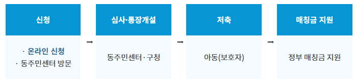 아동의 통장에 본인 또는 후원자가 일정 금액을 저축하면, 지자체(국비 포함) 1:2로 매칭해 보조금(월 최대 10만 원)을 추가로 적립해주는 방식입니다.