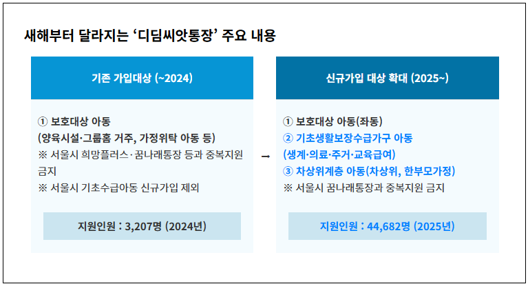 서울시가 저소득층 아동이 학자금, 취업, 주거비 마련 등 자립에 필요한 목돈을 마련할 수 있도록 자산형성을 돕는 ‘디딤씨앗통장’ 가입대상을 새해부터 대폭 확대하기로했습니다.