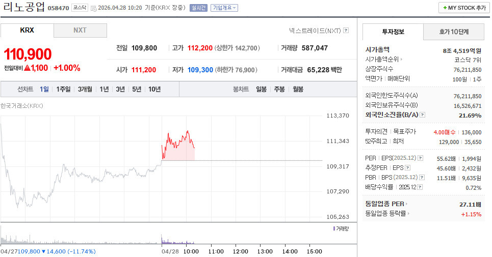 리노공업은 오랜 기술 축적을 바탕으로 높은 영업이익률을 유지하고 있으며, 이는 주가의 하방을 지지하는 요소로 작용합니다. 단순 제조 기업이 아닌 기술 기반 기업으로 평가받는 이유입니다.