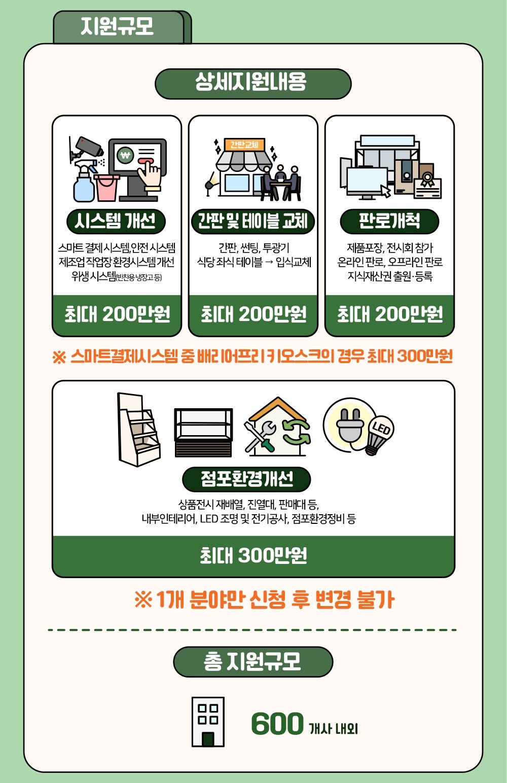 점포환경개선 300만 원  진열대 교체, 조명·바닥·벽면 개선, 소형 인테리어 등