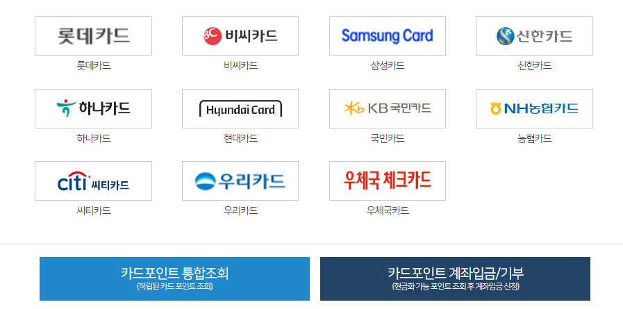 여신금융협회를 통해 삼성,국민, 롯데, 비씨, 신한, 하나, 현대, 농협, 우리, 시티, 우체국 카드의 포인트를 모바일에서 확인하고 현금으로 전환할 수 있습니다.