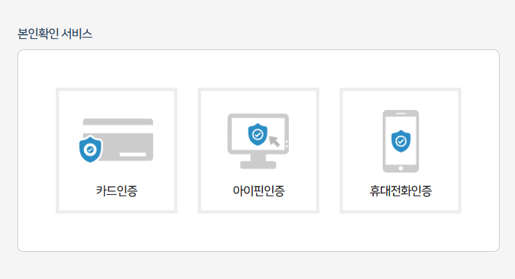 개인정보약관에 동의하시고 다음을 누르신 후, card, 아이핀, 휴대폰 중 편하신 방법으로 인증을 하시면 됩니다.