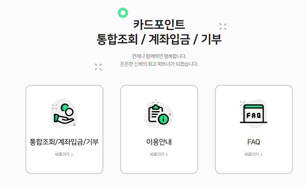 카드포인트통합조회 / 계좌입금 / 기부 언제나 함께하면 행복합니다. 든든한 신뢰의 최고 파트너가 되겠습니다.