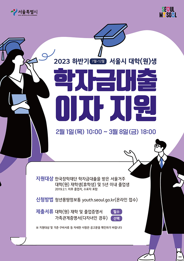 우선, ▴학자금대출 이자지원은 2월 1일 오전 10시부터 3월 8일 18시까지 청년몽땅정보통에서 신청받으며, 한국장학재단 학자금 대출을 받은 서울 거주 대학(원) 재학생, 휴학생, 5년 이내 졸업생이면 누구나 신청할 수 있습니다.