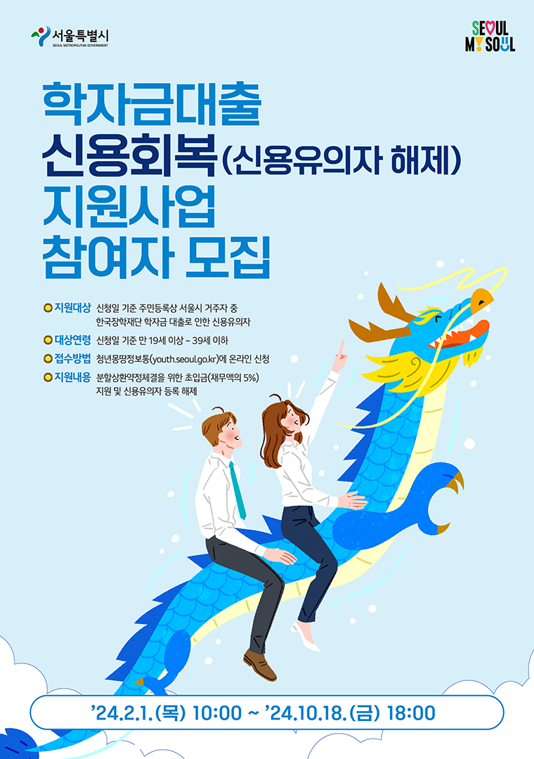 학자금 대출로 인한 신용유의자로 등록해제를 원하는 서울 거주 만 19~39세 청년은 2월 1일 10시부터 10월 18일 18시까지 청년몽땅정보통을 통해 온라인으로 신청하면 됩니다.