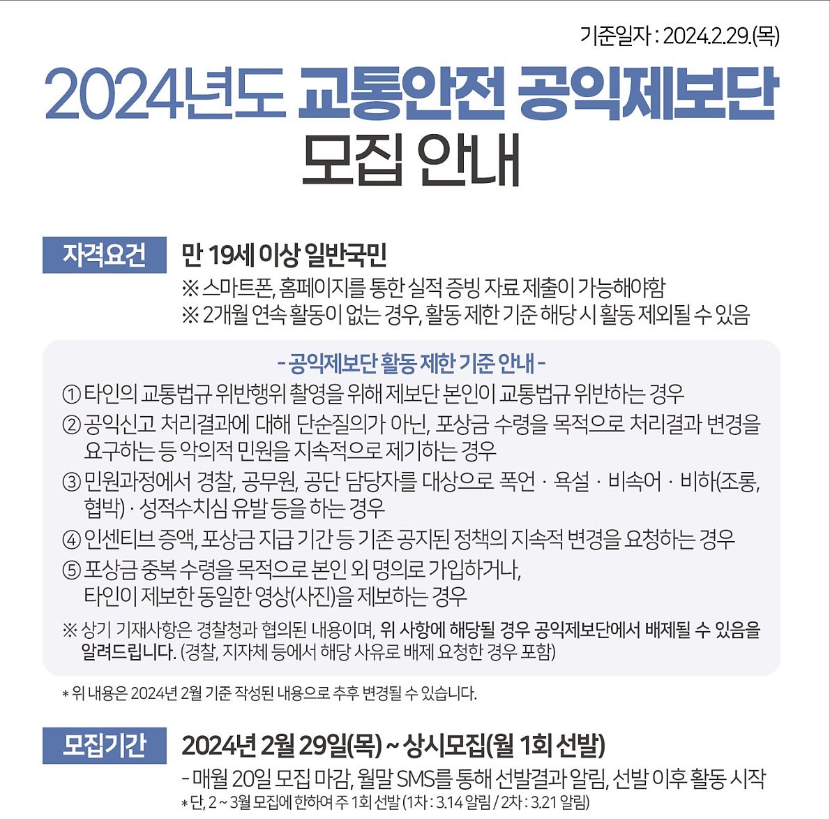 이 프로그램은 단순히 포상금을 받는것을 넘어서 우리 사회의 교통안전을 위해 큰 기여를 하는 취지를 가지고 있습니다. 교통법규를 준수하여 안전한 도로 환경을 만드는 데에 모두가 함께 참여해 보시기 바랍니다.