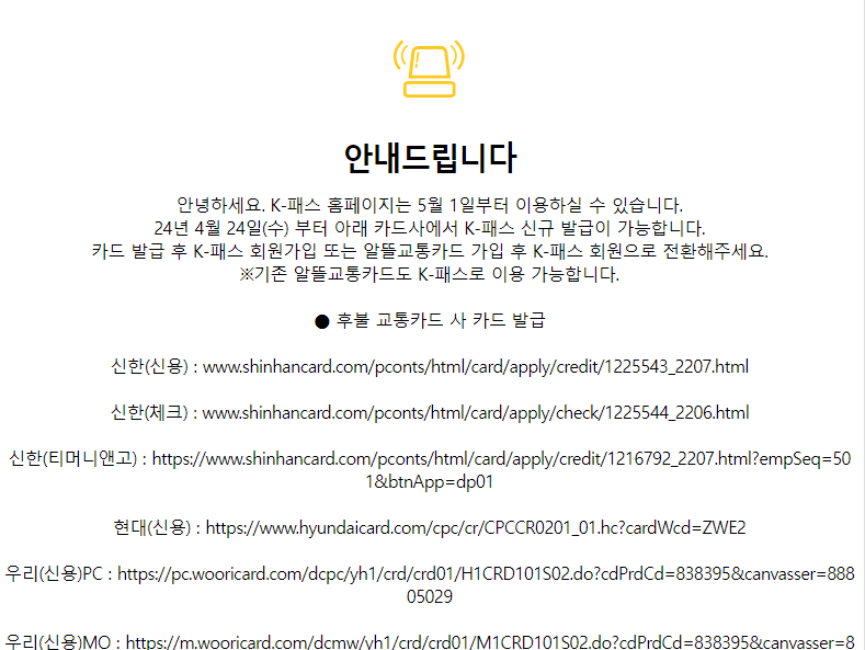 기존에 알뜰 교통카드를 사용하는 사람이 아니라면 신규발급을 해야 하고 5월 1일 이전에 신청을 완료해야 원하는 기간에 사용이 가능합니다. 만약 신규발급 신청을 일찍 해서 K-패스 교통카드를 받았다면 현재 운영하는 알뜰교통카드 홈페이지와 앱에서 회원가입을 진행하면 됩니다. 이때 K-패스로 회원전환은 꼭 해야 합니다.